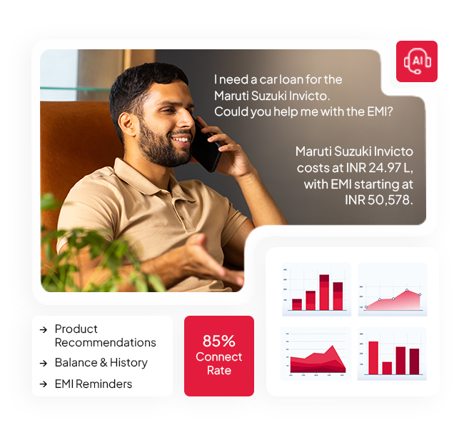AI voice bots excel across a wide range of banking operations, propelling customer engagement. The most common applications include account inquiries, transaction history, fraud alerts, loan servicing, and collections. It can also handle complex queries like outbound campaigns, provide proactive support, and drive revenue growth.